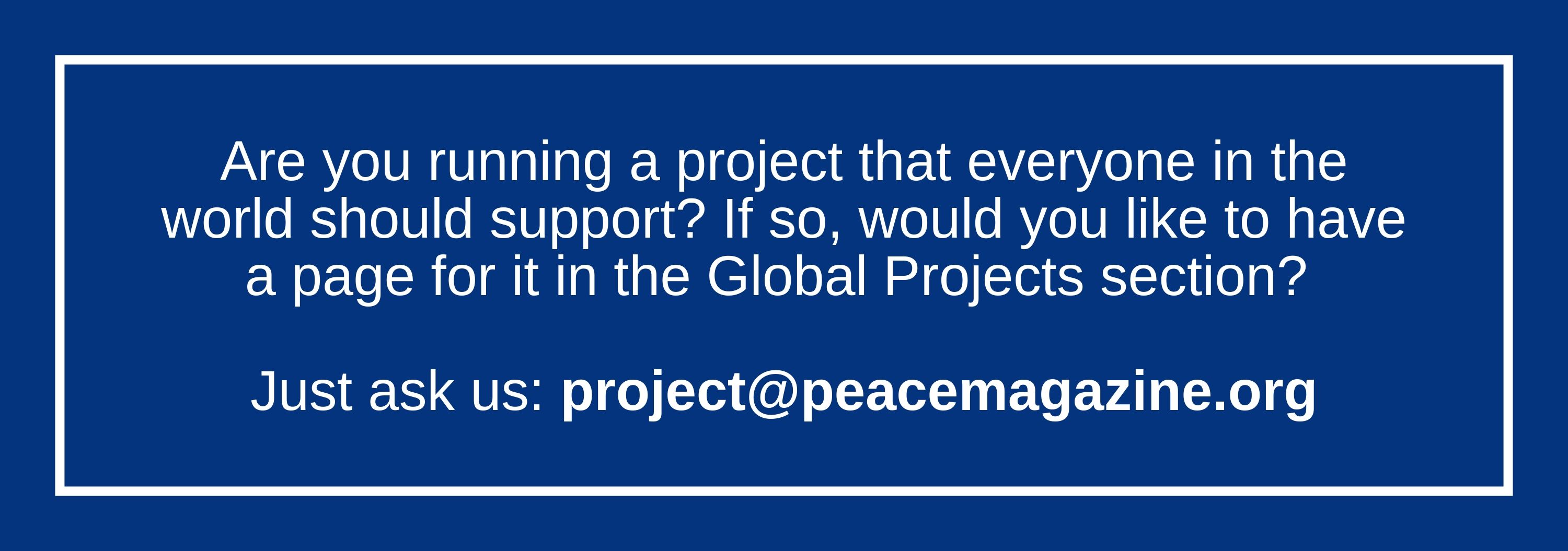 Project Save The World Board of Directors Staff Peace Magazine Peace Magazine Editorial Committee Section Editors Platform for Survival Policies Contact